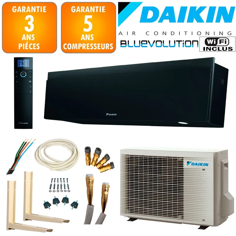 Avec une émission sonore de 19 dB à l'intérieur et de 46 dB à l'extérieur, le pack climatiseur Mural Daikin Emura FTXJ20AB est silencieux. En optant pour un modèle noir, son coloris plus original que celui proposé par les modèles blancs vous permettra de l'intégrer tout simplement à une déco actuelle.